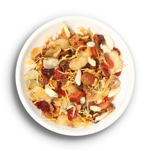 Eigenlijk is deze fruitthee een mix van fruit én groente, want naast rozenbottel, appel, vijg en banaan, is de thee verrijkt met pompoenpitten, stukjes wortel en biet. De thee is mild, fruitig en aangenaam zoet.